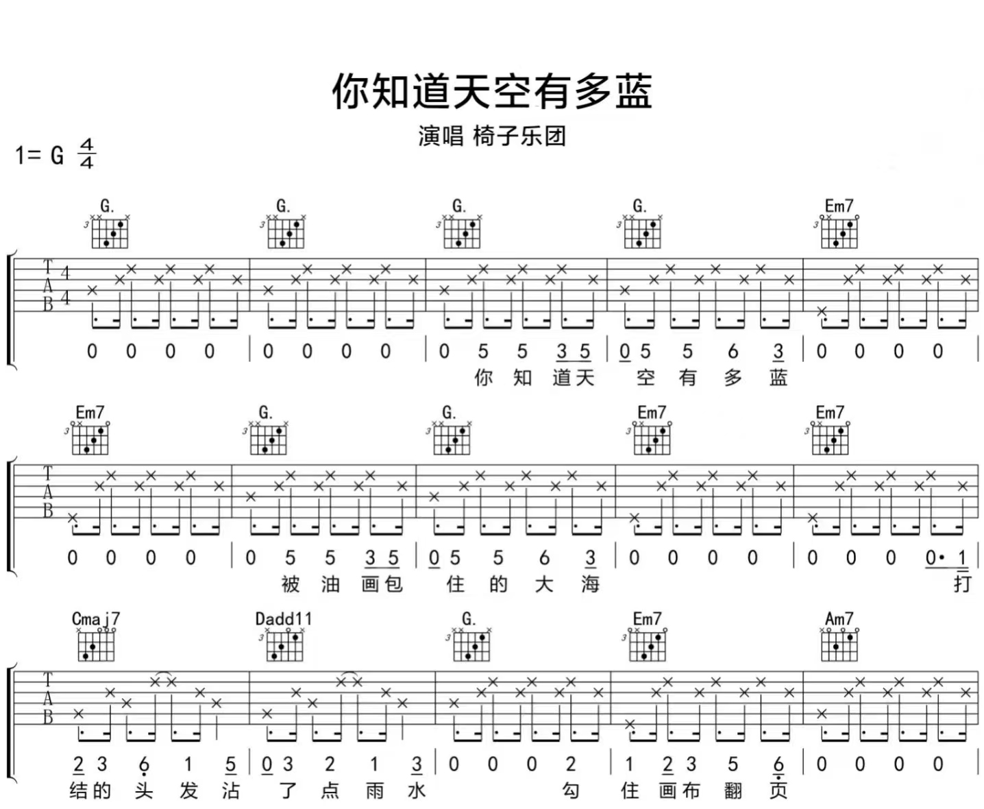 你知道天空有多蓝吉他谱,椅子乐团唱出对自由、远方与纯粹美好的向往,用温柔旋律描绘出治愈的生活图景,感受当下的轻松与浪漫。《你知道天空有多蓝》吉他弹唱谱,选用G调指法编配,高清完整版共三张图片六线谱。